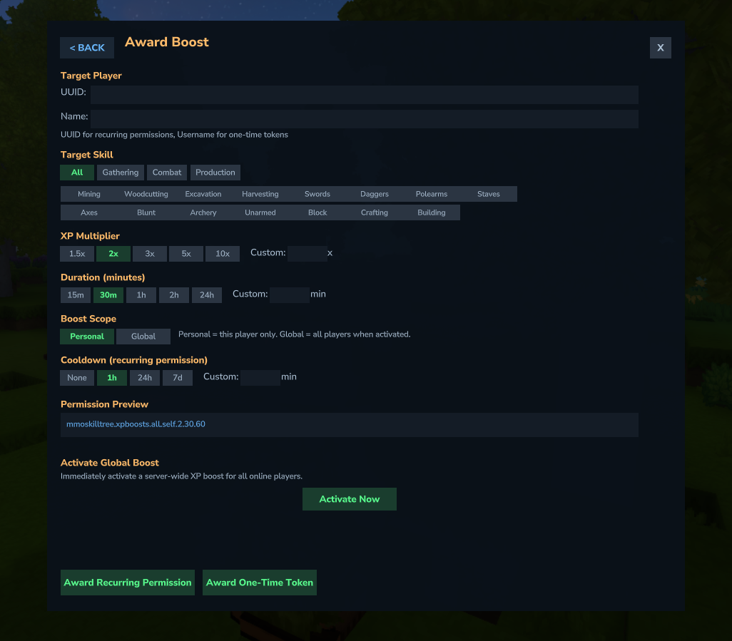 New in 0.5.9: A visual admin UI for granting boosts to players without memorizing command syntax. Access via the "Award Boost" button in /mmoadmin.