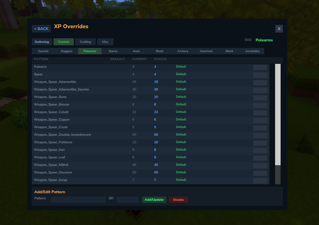-1- Explicitly disable a pattern (no XP given)0- Pattern gives zero XP (still processed)- Positive number - XP awarded for matching blocks/items