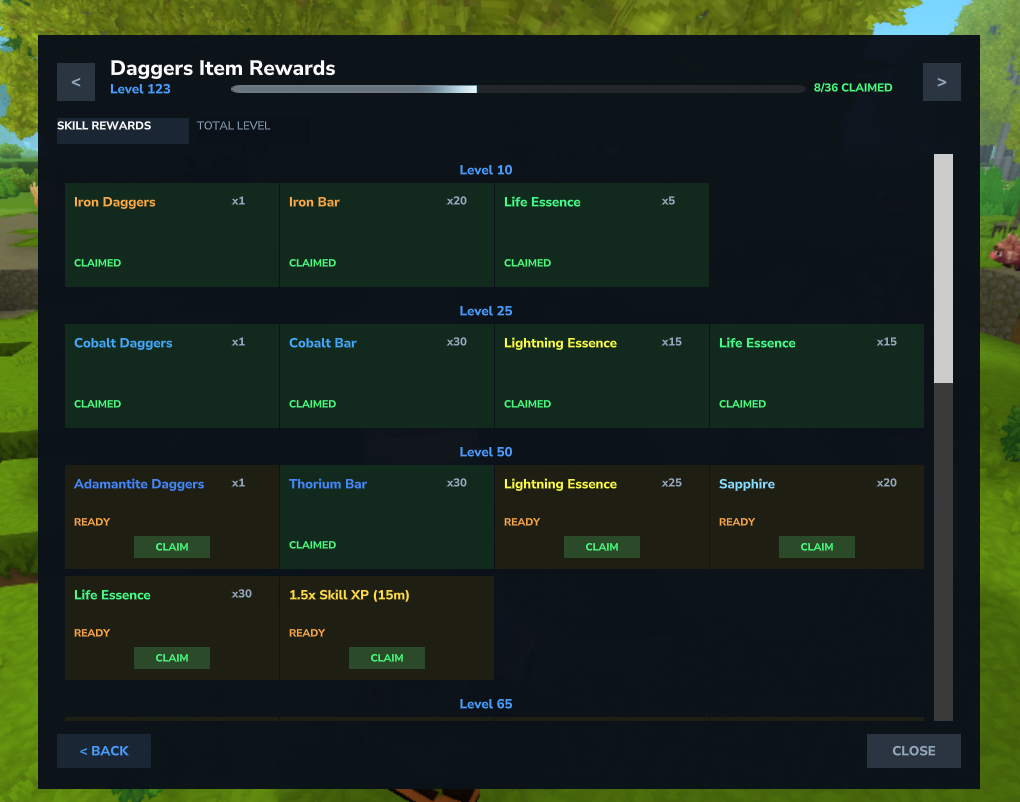 New in 0.6.0: Every skill earns bonus items at milestone levels (10, 25, 50, 65, 80, 100). These are tracked per-skill - Mining 50 and Swords 50 each independently trigger level 50 global rewards.