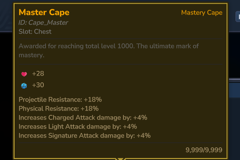 The Master Cape is the best cape in the game, earned at total level 1500. It provides the highest resistance and health of any cape, plus bonus mana and a boost to all three damage types.